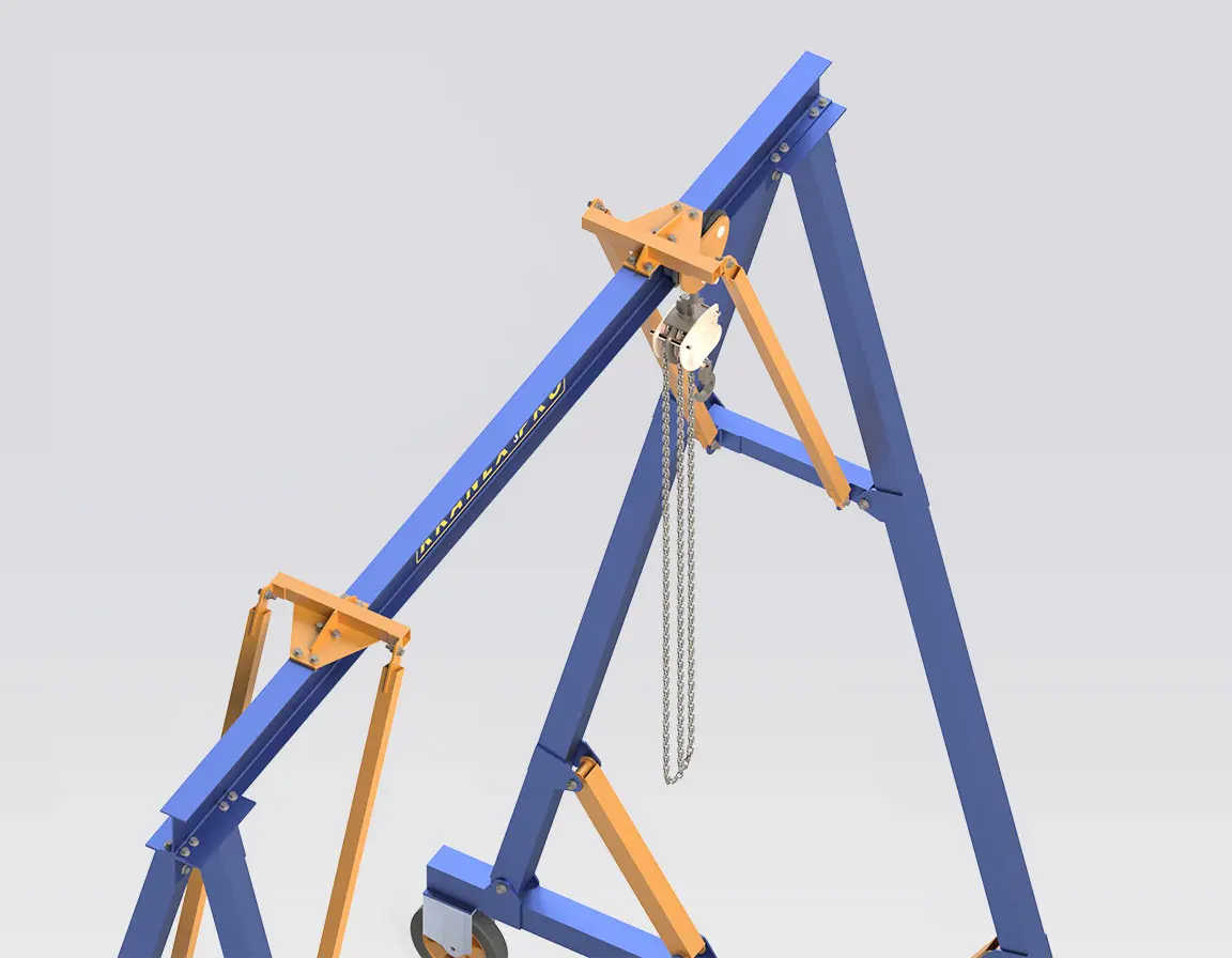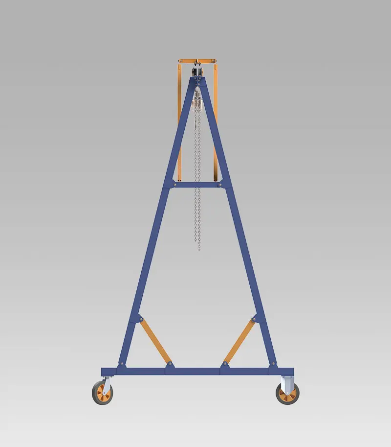 • Structure légère et démontable: La grue portique peut être démontée ou repliée pour occuper une emprise compacte d’environ 0,44 × 0,91 × 3,15 m, ce qui facilite le transport, le stockage et le transfert rapide entre différents sites.